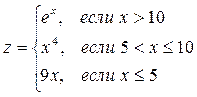 Очевидно, что при решении данной задачи придется проверить не одно, а два условия. Например, проверим выполнение условия х>10. В случае его выполнения путь решения очевиден - следует вычислить z=ex (для вычисления экспоненциальной функции в Excel существует функция EXP). Если же условие х>10 не выполняется (что равнозначно выполнению условия х<10), возникает неопределенность: возможно, х<5, а может быть, значение х находится в интервале (5;10]. Чтобы разрешить эту неопределенность, придется проверить еще одно условие, т.е. использовать в качестве выражения 2 функции ЕСЛИ новую функцию ЕСЛИ. Например, можно проверить с помощью второй функции ЕСЛИ условие х>5 (а можно и х<5, в этом случае выражение 1 и выражение 2 второй функции ЕСЛИ поменяются местами по сравнению с проверкой условия х>5).