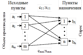 Обозначим количество продукции, производимой в пункте i, через ai, а количество продукции, потребляемой в пункте j, - через bj; cij - стоимость перевозки единицы продукции из i в j. Таким образом, транспортная задача сводится к минимизации транспортных расходов z при перевозке из исходного пункта в конечный количества продукции равного xij: