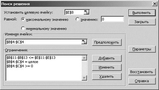 б) в ячейку E8 введем формулу для вычисления значения ЦФ. Можно ввести формулу =В4*В8+С4*С8, а можно воспользоваться функцией =СУММПРОИЗВ(В4:С4;В8:С8).