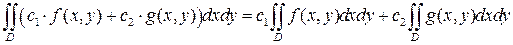 1) Свойство линейности. Если функции f (x,y)и g(x,y) интегрируемы по области D, то справедлива формула: