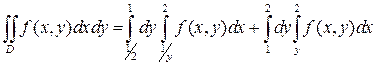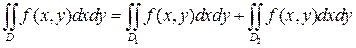 2) Свойство аддитивности. Если область D разбита на две области D 1 и D 2 без общих точек, и функция f (x,y)интегрируема во всех точках области D, то справедлива формула: