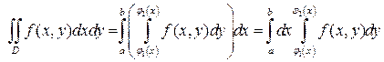 Вычисление двойных интегралов сводится к вычислению повторных интегралов следующим образом. Пусть область D ограничена слева и справа вертикальными прямыми x=a, x=b, а снизу и сверху – кривыми
