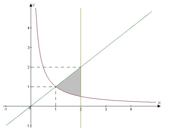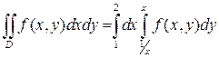 область интегрирования D ограничена линиями x= 2, y=x, y= 1 /x.