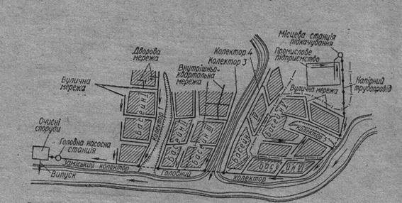 Сточные воды отдельных домов или цехов собираются в дворовых, квартальных и заводских сетях и направляются в уличную сеть, которая представляет собой систему подземных трубопроводов, которые транспортируют стоки к насосным станциям или очистным сооружениям. Канализованная территория населенного пункта или предприятия делится на бассейны канализирования, т.е. площади, ограниченные линиями водораздела и естественными границами городов, заводов и др. (рис.9.1.).