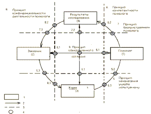 Этические нормы охватывают различные аспекты деятельности учёных: проведение научных исследований, публикацию полученных результатов, проведение научных конференций и дискуссий. Этика науки запрещает умышленное искажение истины, плагиат, требует постоянной инновационной деятельности. Помимо общенаучных принципов, психолог должно учитывать этику психологического исследования. В этом плане, основным документом, регламентирующим профессиональную деятельность психолога (в том числе и научно-исследовательскую) выступает Этический Кодекс Российского Психологического Общества. В нем отмечается: «Профессиональная деятельность психолога, в какой бы области он ни работал (профориентация, организация производства, клиническая, возрастная, педагогическая психология, судебно-психологическая экспертиза, преподавательская или научная деятельность), характеризуется его особой ответственностью перед клиентами, обществом и психологической наукой». Этический Кодекс дает возможность психологам и людям, с которыми они профессионально связаны, а) руководствоваться принципами, правилами, нормами получения и применения психологических знаний, б) устанавливать стандарты, по которым могут быть оценены результаты применения психологических знаний. Ниже, на рисунке 1 приведена схема регламентации этическими принципами и правилами отношений, возникающих в психологической деятельности.