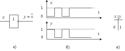 Электронный ЛЭ, реализующий функцию “Отрицание” в виде определенных уровней электрических сигналов, называют инвертором или ЛЭ “НЕ”. Инвертор на схемах изображается, как показано на рис. 1, а. Вход ЛЭ слева, выход – справа. На выходной линии, в месте соединения ее с прямоугольником, изображается кружок – символ инверсии. На языке цифровой техники инверсия означает, что выходной сигнал (у) противоположен входному (х). Сказанное иллюстрирует рис. 1, б, на котором приведены временные диаграммы инвертора.