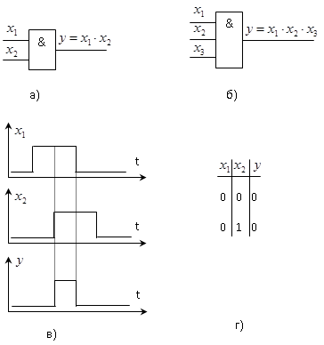 Функция “конъюнкция” равна 1 тогда и только тогда, когда все ее аргументы равны 1. ЛЭ, реализующий функцию “Конъюнкция” называют конъюнктором или ЛЭ “И”. На рис. 6 приведены: условное графическое изображение двухвходового (а) и трехвходового (б) конъюнкторов; временные диаграммы (в) и таблица истинности (г) двухвходового конъюнктора.