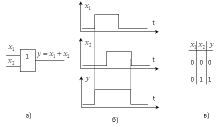ЛЭ, реализующий функцию “дизъюнкция”, называют дизъюнктором или ЛЭ “ИЛИ”. Условное изображение и временные диаграммы ЛЭ “ИЛИ” приведены на рис. 7