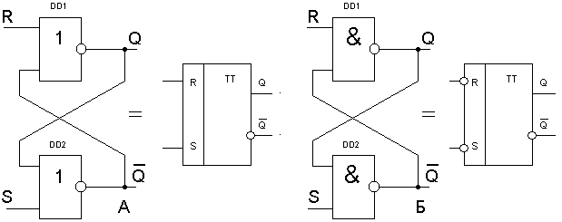 Асинхронный RS-триггер. В зависимости от логической структуры различают RS-триггеры с прямыми и инверсными входами. Их схемы и условные обозначения приведены на рисунке. Триггеры такого типа построены на двух логических элементах 2ИЛИ-НЕ - триггер с прямыми входами (А), 2И-НЕ - триггер с инверсными входами (Б).