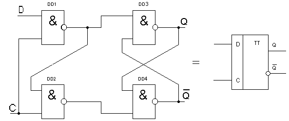 Тактируемый D-триггер. Он имеет информационный выход и вход синхронизации. Одна из возможных структурных схем однотактного D-триггера и его условное обозначение показаны на рисунке 28.