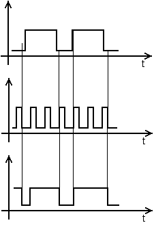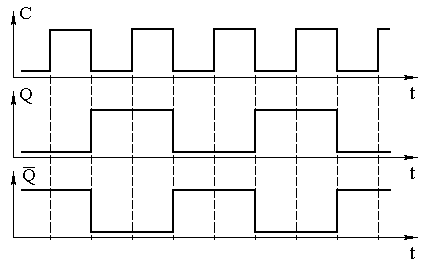 На рисунке 29 изображены временные диаграммы тактируемого D-триггера. В таком триггере происходит задержка сигнала на выходе по отношению к сигналу, поданному на вход. на время паузы между синхросигналами. Для устойчивой работы триггера необходимо, чтобы в течение синхроимпульса информация на входе была неизменной.