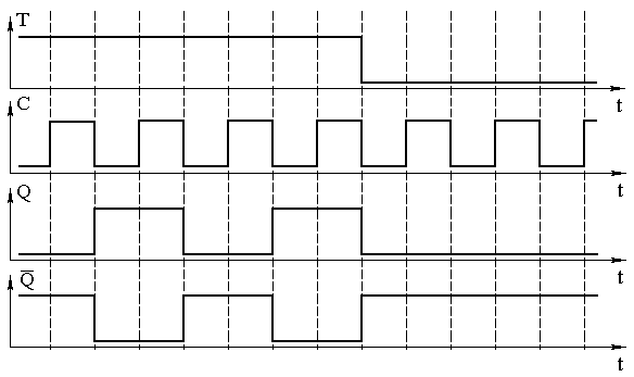 Подобная схема счетного триггера может быть реализована и на JK триггере. Временная диаграмма синхронного T триггера приведена на рисунке 34, а его условно-графическое обозначение — на рисунке 35.