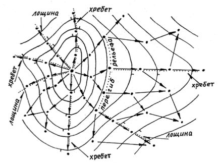Для построения рельефа должны быть сняты все его характерные точки и линии (вершины возвышенностей, дно котловин, точки седловин и перегибов рельефа, линии водоразделов и водосливов, подошвы и бровки и др.) – (рис. выбор съёмочных пикетов для съёмки рельефа). На абрисах тахеометрической съёмки выполняют не только примерную зарисовку рельефа, но и указывают направления однородных скатов в сторону понижения (стрелками между точками, расположенными на однородных скатах.