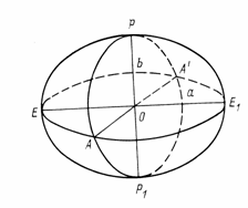 При решении задач высшей геодезии за такую модель Земли принимают эллипсоид вращения с малым полярным сжатием, называемый общим земным эллипсоидом (рис. 4). Его поверхность может быть получена вращением полуэллипса РЕР1 вокруг его малой оси РР1.