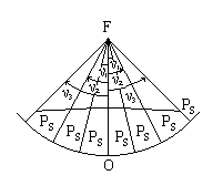Сначала проводят дугу окружности радиусом R с центром в точке F (рис.7.10); пусть для конкретности R =55 мм. Эта дуга является основной кривой, точка "нуль" которой наводится на нуль или на рис. 7.10. отсчет V рейки. Затем рассчитывают расстояния pS и ph для разных углов наклона при заданных значениях C=100, K=10 (K=20) и fоб= 251 мм; например: