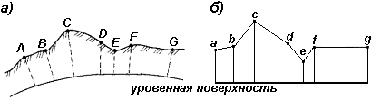 Как правило, разрез местности (рис. 27, а) представляет собой кривую линию ABC...G. На профиле (рис. 27, б) она строится в виде ломаной линии abc...g. Уровенную поверхность изображают прямой линией. Для большей наглядности вертикальные отрезки (высоты, превышения) делают крупнее, чем горизонтальные (расстояния между точками).