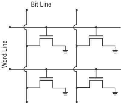 Как уже отмечалось, для инициализации ячейки памяти, то есть для получения доступа к содержимому ячейки, необходимо подать напряжение на управляющий затвор. Поэтому все управляющие затворы должны быть подсоединены к линии управления, называемой линией слов (Word Line). Анализ содержимого ячейки памяти производится по уровню сигнала на стоке транзистора. Поэтому стоки транзисторов подключаются к линии, называемой линией битов (Bit Line).