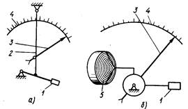 Гигрометры: а - волосяной, б - пленочный; 1 - груз, 2 -волос, 3 - стрелка, 4 - неравномерная шкала, 5 - пленочная мембрана