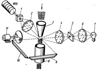 1, 5 - диафрагма, 2, 4, 6 - объективы, 3 - сопло, 7 - источник света, 8, 10 - призмы, 9 - трубка вывода аэрозоля, 11 - модулятор светового потока