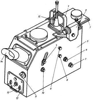 1- держатель, 2 - угломерная головка, 3 - подвижная плита, 4,11,13 — ручки поворота, подъема экрана и регулирования интенсивности освещения шкалы, 5 - корпус, 6, 9 - ручки регулирования светового луча, 7, 8 – ручки регулирования диафрагмы объектива, поворота верхнего зеркала; 10 - ручка цанговогозажима, и поворота зеркала наблюдения, 12- панель электрического блока, 14 – кожух, 15 – ориентируемый образец