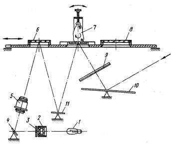 1 - источник света, 2 - конденсор, 3 - сменная диафрагма, 4, 6, 8, 10, 11 - зеркала, 5 - объектив, 7 - образец (монокристалл), 9 - матовый экран