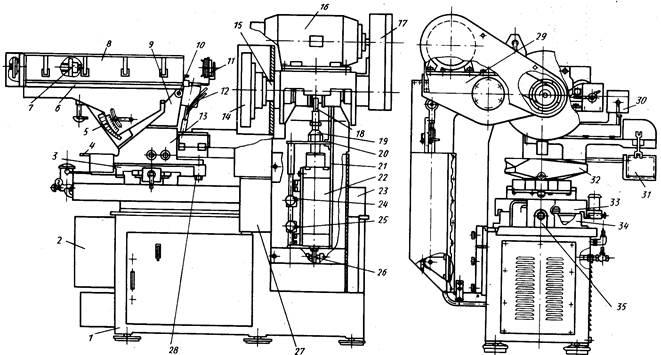 1 - станина, 2 - привод механизма присоски, 3 — каретка, 4,5 - шкалы, 6 - направляющая, 7 - прижим, 8 - механизм подачи слитка, 9,13 — корпуса, 10,28 - оси, 11 - присоска, 12 — ловитель, 14 - барабан крепления алмазного диска, 15 - шпиндель, 16 - электродвигатель, 17— плоскоременная передача, 18, 26 - верхняя и нижняя опоры, 19 - шток гидроцилиндра, 20 - редуктор, 21 - рейка, 22 — гидроцилиндр, 23 - тумба, 24, 25 — упоры, 27 - гидравлическая панель, 29 - коромысло, 30 - механизм присоски, 31 - бачок (емкость) для пластин, 32 — резервуар, 33 — стол, 34 — плита, 35 — цилиндр-подпор