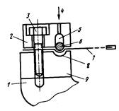 1 - корпус, 2, 9 — съемное и наружное кольца, 3 - винт, 4 - входной клапан, 5 - пространство между кольцами, 6 - резиновая прокладка, 7 - алмазный диск, 8 - кольцевая проточка