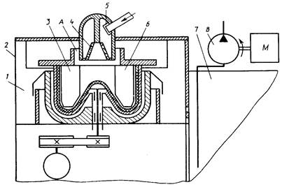 1 - центрифуга, 2,7- корпуса, 3 - резиновый отстойник, 4 - колпачок, 5 - фильтр, 6 - мешалка, 8 - шестеренчатый насос