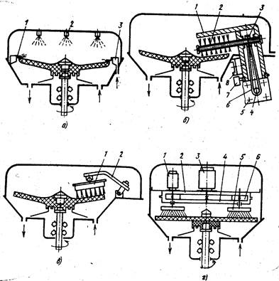 В узлах обработки большинства известных конструкций центрифуг применяются форсунки, подающие распыленную струю реактива или деионизованной воды к обрабатываемым пластинам (рисунок ниже, а), возможно также применение специальных штуцеров для подачи инертного газа, ускоряющего сушку пластин.