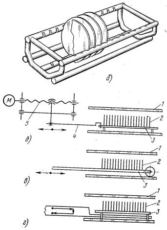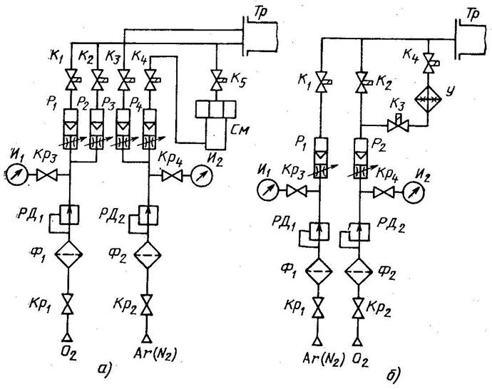 Система газораспределения включает блоки диффузии (рисунок а) и окисления (рисунок б), формирующие ПГС заданного состава и подающие их в каждую реакционную трубу установки. На входы системы подаются тщательно очищенные и осушенные (точка росы -65С) кислород и аргон (азот). Каналы для технологических газов включают ручные запорные краны Кр, фильтры Ф, очищающие газы от пылевых частиц, регулятор давления РД, электромагнитные клапаны К, открывающиеся на время работы канала, ротаметры Р, контролирующие расходы газов, и манометры И. при загонке примесей из жидких диффузантов на первой стадии диффузионного процесса аргон проходит через смеситель См (рисунок а), помещенный в микрохолодильник для стабилизации параметров получаемой ПГС. На этапе окисления подложек в реакционную камеру подается сухой или влажный кислород; для увлажнения кислород пропускается через термостатированный увлажнитель У (рисунок б). Система автоматического регулирования устройства газораспределения осуществляет контроль температуры холодильника смесителя и термостата увлажнителя, а также программное управление каждым из рабочих каналов установки. Система обеспечивает поддержание температуры в испарителе и увлажнителе с погрешностью ±0,5 С, ее структура аналогична автоматической системе терморегулирования печи.