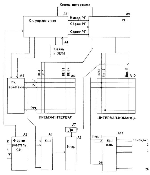 Если номер интервала, поступающий на коммутатор А10 совпадает с номером ВК, регистр выдаёт на схему управления A3 сигнал КОНЕЦ - ИНТЕРВАЛА, по которому производится СБРОС счётчика