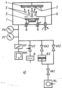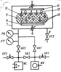 Всхеме в качестве насоса окончательной откачки применен криосорбционный насос NC. Для предварительной откачки используется механический безмасляный насос NV поршневого типа. Управление работой вакуумной системы осуществляется клапанами VA1...VA3, натекателями VF1 и VF2, вакуумметрами РА и РТ.