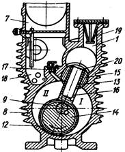 Пластинчато-статорный насос имеет неподвижный корпус 8 – статор, в котором на валу 9 эксцентрично вращается постоянно соприкасающийся с ним ротор 3. Подпружиненная пластина 4 плотно прижимается своим нижним концом к ротору. Выпускной клапан состоит из седла, шарика 10 и пружины 5. Объем рабочей камеры разделен на две полости: I – всасывания, образованную одной стороной пластины 4, а также частью цилиндрических поверхностей статора и ротора, и II – сжатия, образованную другой стороной пластины 4 и остальной частью цилиндрических поверхностей статора и ротора. При вращении ротора в направлении, указанном стрелкой, газ из откачиваемого объема через впускной канал 1 заполняет увеличивающийся объем полости I. В это же время в полости II газ сжимается. Когда давление газа на впускной клапан превышает атмосферное, он открывается и газ из полости II вытесняется. Насосы этого типа за один оборот ротора совершают один цикл откачки, т.е. из откачиваемого объема отделяется и вытесняется только одна порция газа. Пластинчато-статорные насосы, как правило, имеют малую производительность.
