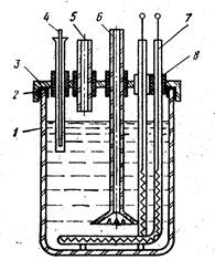 1 — сосуд; 2 — уплотнение; 3 — крышка; 4 — термометр сопротивления; 5 — вывод парогазовой смеси; 6 — распределитель; 7 — нагреватель; 8 — уплотнение