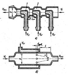 Смешение компонентов начинается в узких соплах 1 и заканчивается в камерах 2 смесителя. Для быстрого и тщательного перемешивания скорость Vr газа-разбавителя устанавливается в 2—3 раза выше скорости технологических газов. Для смешения потоков, имеющих малую кинетическую энергию, рекомендуется смеситель, схема которого изображена на рисунке выше б. Диаметр отверстий dOTB для струи и технологического газа выбирают из условий nd2отв ≤D2, где n — число отверстий для выхода технологического газа; D — диаметр камеры смешения, м.