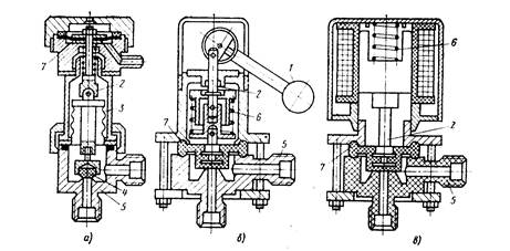а — с пневматическим управлением; б — с ручным управлением; в с электромагнитным управлением;