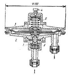 Качественное проведение процессов требует стабилизации параметров. Регулятор давления (рисунок ниже) обеспечивает поддержание заданного давления в канале или на входе в регулятор расхода за счет дросселирования потока газа. Чувствительный элемент регулятора давления — мембрана, воспринимающая усилия, развиваемые задатчиком и давлением газа. При изменении давления мембрана деформируется и перемещает дроссельный регулирующий орган, который изменяет поток газа в камеру регулятора.