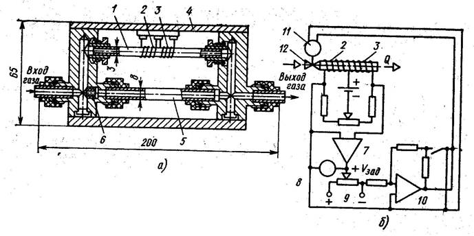 Основная часть расхода газа проходит через трубку 5, в которой установлена диафрагма 6 с калиброванным отверстием. Часть газа проходит через тонкостенную никелевую трубку 1, на которую намотаны обмотки 2 и 3 из медного провода, подключенные к источнику стабилизированного постоянного напряжения 24 В. Под действием потока газа обмотка 2 охлаждается, а температура обмотки 3 понижается в меньшей степени. Обмотки ведут себя как термосопротивления, что вызывает в измерительной диагонали моста сигнал разбаланса, величина которого пропорциональна расходу газа. Для снижения теплового воздействия среды корпус 4 выполнен из материала с высокой удельной теплоемкостью. Сигнал разбаланса усиливается (рисунок выше, б) и подается на стрелочный индикатор 8 расхода газа и на задатчик 9 величины расхода газа.