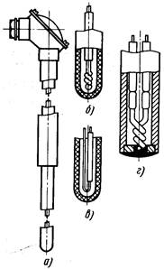 Общий вид (а) и рабочие концы хромель-алюмелевой (б), платинородий-платиновой (в) и малоинерционной (г) термопар