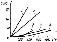 Градуировочные кривые термопар: 1 - хромель-копелевой ХК, 2 - хромель-алюмелевой ХА, 3 - из сплава НК-СА, 4 - платинородий-платиновой ПП, 5 - платинородий-платинородиевой ПР30/6