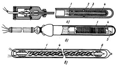 а — Барбера, б - Мейера, в - Стрелкова; 1 - защитная гильза, 2 - отверстие для удаления воздуха и заполнения гелием, 3 - изогнутая стеклянная трубка, 4 - платиновый чувствительный элемент, 5,6 - крестообразные слюдяной и стеклянный каркасы