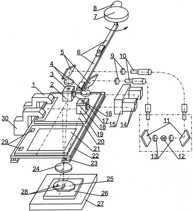 Отличие их состоит в том, что они выполнены в виде полос, рассеивающих падающее от них излучение. Расстояние между штрихами реперных знаков на маске и подложке выбрано таким, что при любом их взаимном положении, кроме одного точного, одновременно совпадают не более одного штриха. При точном совмещении происходит полное совпадение всех штрихов на подложке и маске. Поскольку знаки на подложке рассеивают излучение, момент совмещения знаков соответствует минимуму светового потока, попадающему через объектив 24 в фотоприёмники 14. По сигналам фотоприемников координатная измерительная система производит отсчёт координаты знака на подложке. После точной ориентации подложки и отсчёта координат её реперных знаков измерительный ф/шаблон заменяется ПФО. Для этого каретка 22 с закреплённым на ней ПФО 21 и измерительным шаблоном 20 смещается на шариковых направляющих 23 вдоль оси У. Привод каретки включает электродвигатель 8, червячный редуктор 7 и тяги 6. Крайние положения каретки задаются упорами, для точной ориентации измерительного шаблона и ПФО используются знаки базирования 29, положение которых контролируется датчиками базирования 1 и 30.