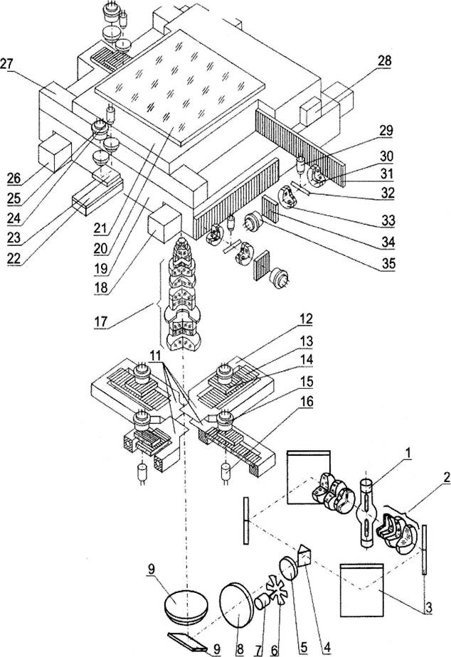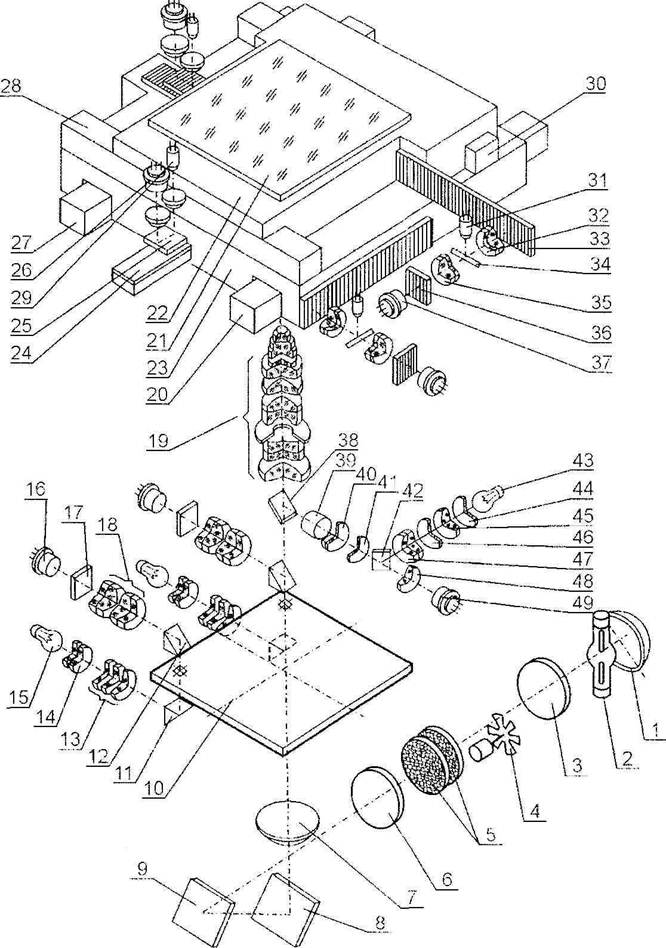 | 27- Аэростатическая направляющая 28 -Аэростатическая направляющая 29- Излучатель 30- Аэростат 31 - С вето диод 32- Линза 33- Измерительная линейка 34- Полупрозрачное зеркало 35- Линза 36- Растр 37- Фотоприемник 38-Зеркало 39- Компенсатор хроматизма 40- Сканирующий диск 41- Второй растр 42- Полупрозрачное зеркало 43- Источник 44- Светофильтр 45-Линза 46- Растр 47- Склеенная линза 48- Линза 49- Фотолриемник |