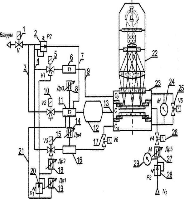 Установки построены по единой схеме и содержат следующие основные узлы: осветитель, механизм прижима, вакуумно-пневмотическую систему. В исходном состоянии крышка механизма прижима 23 открыта, все клапаны включены. Через запорный клапан 1 установка соединяется с источником вакуума. Для закрепления ЭФШ включается клапан 5, соединяя источник вакуума через регулятор 2, канал 4, распределитель 6 и канал 9 с камерой С,.