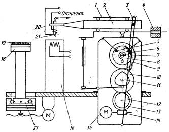 Установка монтажа кристаллов ЭМ-438А предназначена для монтажа кристаллов методом эвтектической пайки с ультразвуковым воздействием и является одной из первых установок этого типа, реализующих автоматический цикл работы. Принципиальная схема установки изображена на рисунке. Рабочий столик 16 оснащен устройством подогрева и системой подачи дискретных корпусов или отрезков лент с выводными рамками из кассет или системой протягивания сплошной ленты-носителя с выводными рамками. Столик 18 с установленной на нем кассетой с кристаллами 19 перемещается координатным приводом 17 так, что под инструментом 21, закрепленным в ультразвуковой головке, в начале каждого цикла обработки останавливается очередная ячейка кассеты с кристаллом. Инструмент опускается, включается вакуумная присоска, захватывает кристалл, затем инструмент перемещается в рабочую зону над столиком 16. Здесь кристалл опускается в корпус или на выводную рамку, установленные на столике и предварительно разогретые до температуры 523... 723 К (250... 450°С). Подачей тока в спираль 20 инструмент 21 также нагревается до 393... 573 К (120... 300°С), включается ультразвуковой генератор и производится процесс пайки. Вертикальные движения инструмент получает от электродвигателя 15, совершающего реверсивное вращение на один оборот в одну и другую стороны. При этом вращение передается через червяк 14 и червячное колесо 13, пару шестерен 12 и 10 на кулачок 11, толкатель которого поднимает и опускает сварочную головку.