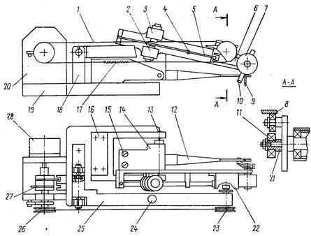 Механизм микросварки изображен на рис. ниже. На основании 19 закреплены кронштейны 16, 18 и 20, на которых смонтированы основные узлы механизма: сварочная головка 14, рычаг механизма подъема 25 и привод механизма подъема.