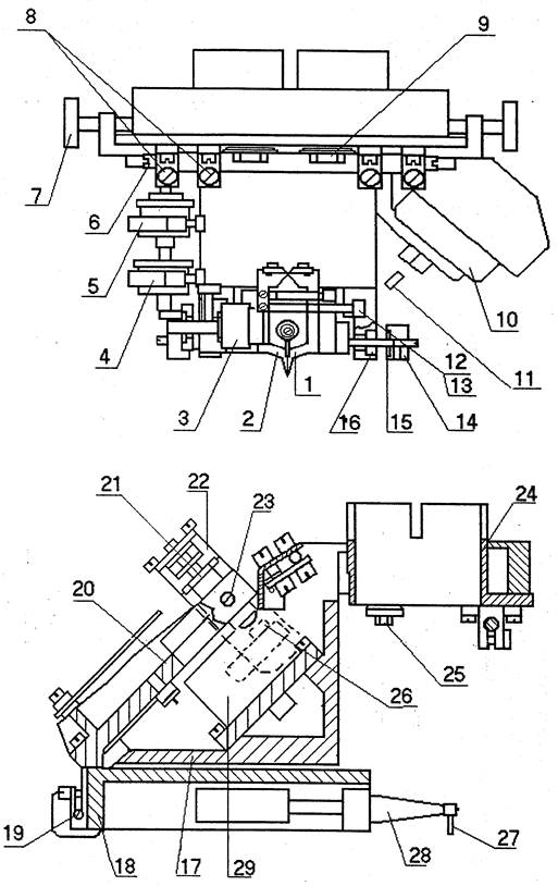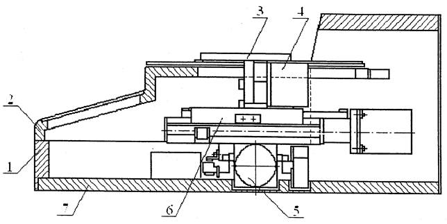 Станина состоит из стола координатного 5 для перемещения по координате X (ход 200 мм), стола координатного 6 для перемещения по координате У (ход 120 мм), привода 4 для перемещения по координате Z основания 3 на котором устанавливаются обрабатываемые приборы, корпусов 1 и 2, плиты 7.