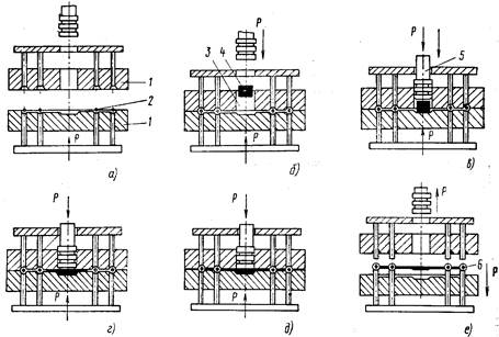 Непосредственно перед герметизацией перфоленту определенной формы и длины со смонтированными ИС укладывают, фиксируя по перфорации, в пресс-формы, которые закрывают, и производят прессование. В процесс прессования — заливки пресс-формы — входят следующие операции (рис. ниже): загрузка перфоленты и смыкание литьевой формы (а), загрузка пластмассовой таблетки (б), ввод пуансона (трансфера) в литьевую форму (в), расплавление пластмассы под высоким давлением (г), заливка формы пластмассой под низким давлением и выдержка (д), размыкание литьевой формы и съем изделия (е).