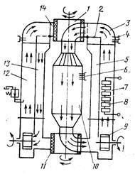 Рабочая камера 10(рисунок ниже) выполнена, в видетонкостенной оболочки толщиной 0,8 мм из нержавеющей стали, усиленной швеллерообразным профилем из той же стали. Камера связана с верхним 1 и нижним 11 переключателями потока газов, представляющими собой тонкостенные стаканы, вращающиеся в текстолитовом корпусе на насыпных шарикоподшипниках большого диаметра.