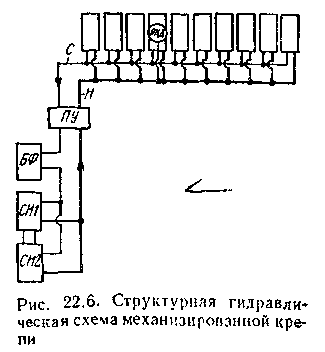 - Для гидропривода характерно: применение высокого рабочего давления (в гидросистеме 20—32 МПа, в замкнутой системе гидростойкн 32—63 МПа), использование в качес!ве рабочей жидкости негорючей водомаеляной эмульсии; применение большого количества однотипной гидроаппаратуры. Работа гидропривода происходит в стесненных и тяжелых условиях очистною забоя. Структурная гидравлическая схема механизированной крепи (рис. 22.6) показывает принципиальное распределение потока рабочей жидкости (эмульсии) от двух насосных станций СН1 и СН2 по напорной г
